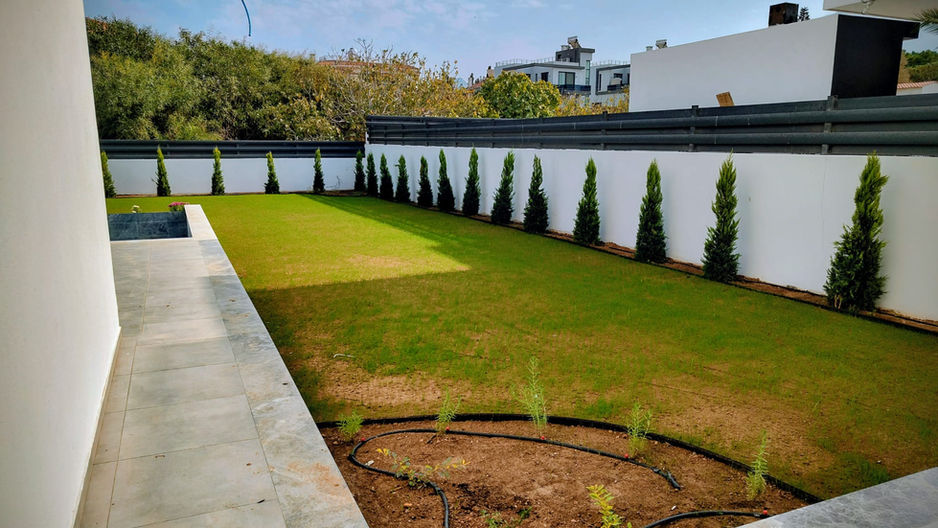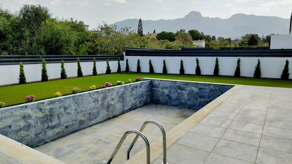 Outdoors, a 5x10 m swimming pool is surrounded by a beautifully landscaped garden with an automatic irrigation system, providing a serene backdrop for relaxation or entertaining. The property features thermally insulated, heavy-series aluminum windows with energy-efficient comfort glass, ensuring style and sustainability in equal measure. A usable rooftop terrace offers panoramic views and the perfect space for sunset gatherings. The Modern Villa blends technology, design, and luxury to create a truly exceptional home in one of North Cyprus’s most desirable coastal locations.